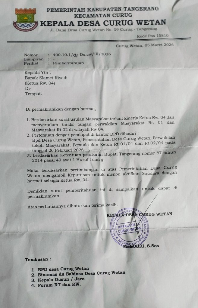 Hingga berita ini diterbitkan, Kepala Desa Curug Wetan belum memberikan klarifikasi resmi terkait alasan maupun dasar hukum penonaktifan Ketua RW 04 tersebut.
