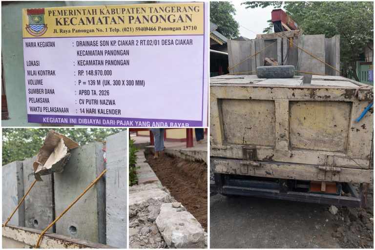 DENTUMNEWS.COM, Tangerang | Pembangunan saluran drainase di lingkungan SDN Kampung Ciakar 2, RT 02/01, Desa Ciakar, Kecamatan Panongan, Kabupaten Tangerang, menuai sorotan tajam. Proyek yang dibiayai anggaran sebesar Rp148.970.000 tersebut diduga tidak mengindahkan spesifikasi teknis serta standar kualitas konstruksi yang berlaku. Minggu (19/04/2026).