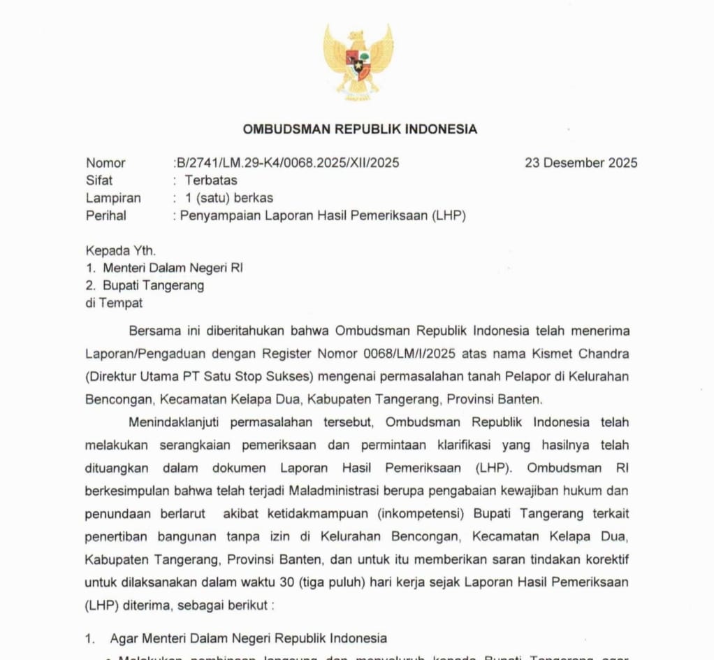 DENTUMNEWS.COM,Tangerang | Ombudsman Republik Indonesia telah menyelesaikan pemeriksaan atas laporan pengaduan yang masuk, dan menemukan adanya maladministrasi serta pelanggaran hukum yang dilakukan oleh Pemerintah Kabupaten Tangerang. Temuan ini dituangkan dalam Laporan Hasil Pemeriksaan (LHP) dengan nomor B/2741/LM.29-K4/0068.2025/XII/2025, tertanggal 23 Desember 2025.