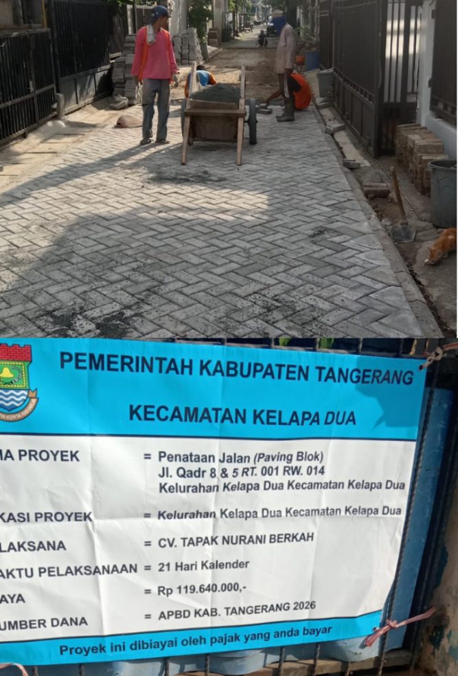 DENTUMNEWS.COM,Tangerang | Pembangunan infrastruktur di lingkungan masyarakat sejatinya menjadi harapan besar warga untuk meningkatkan kenyamanan dan kualitas hidup. Berbagai usulan yang diajukan akhirnya mulai terealisasi, salah satunya proyek paving blok di Jalan Qodr RT 001/014, Kelurahan Kelapa Dua, Kecamatan Kelapa Dua, Kabupaten Tangerang, Banten, Rabu (29/04/2026).